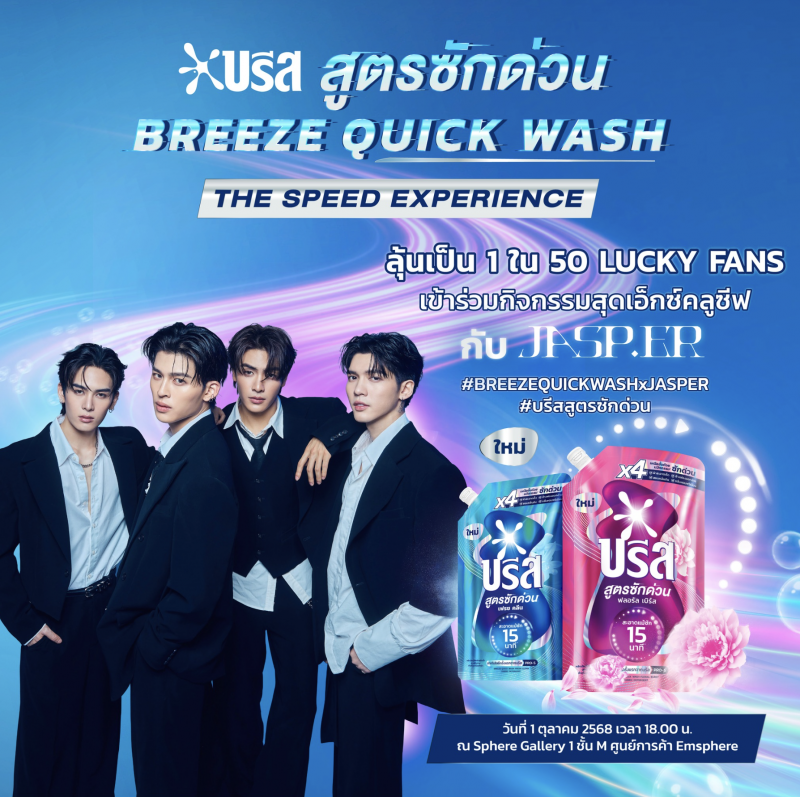 ยูนิลีเวอร์ ผู้นำตลาดสินค้าอุปโภคบริโภคระดับโลกและนวัตกรรม เตรียมจัดบิ๊กอีเว้นท์เปิดตัวผลิตภัณฑ์ใหม่ล่าสุด “บรีส สูตรซักด่วน” ในงาน “BREEZE QUICK WASH : THE SPEED EXPERIENCE” เพื่อตอบโจทย์ความต้องการของผู้บริโภคยุคใหม่ที่ใช้ชีวิตแข่งกับเวลา โดยมาพร้อมเทคโนโลยี PRO-S สิทธิบัตรเฉพาะของยูนิลีเวอร์ นวัตกรรมใหม่ที่ช่วยให้ผ้าสะอาด หอมไว แม้ในเวลาเพียง 15 นาที โดยยกขบวนกิจกรรมสุดเอ็กซ์คลูซีฟภายในงาน ทั้งโซนพิสูจน์ประสิทธิภาพสินค้า และโซนเล่นเกมส์ลุ้นของรางวัล พร้อมแท็คทีม 4 หนุ่มสุดฮอต จุง, อู๋, แซนต้า, ปอนด์ วง JASP.ER ที่เรียกได้ว่าเนื้อหอมสุดๆ ในตอนนี้ มาร่วมสัมผัสประสบการณ์ ซักด่วน กับนวัตกรรมใหม่ของ “บรีส สูตรซักด่วน” พร้อมเตรียมเซอร์ไพร์สสุดฟิน และ Special show มามอบให้เหล่าแฟนคลับได้กรี๊ดกันสนั่นงาน งานจัดขึ้น ในวันพุธที่ 1 ตุลาคม 2568 เวลา 18.00 – 19.40 น. ณ Sphere Gallery 1 ชั้น M ศูนย์การค้าเอ็มสเฟียร์ สำหรับผู้ที่สนใจเข้าร่วมกิจกรรมสามารถติดตามรายละเอียดเพิ่มเติมได้ที่ Facebook: Breeze Thailand (บรีส ประเทศไทย)